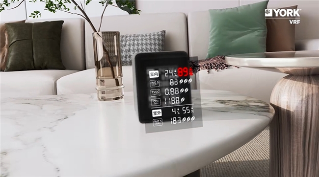 系统搭载约克小方,可实时监测室内温度、湿度、PM2.5、CO₂、TVOC五大核心指标,涵盖日常空气问题,空气质量可视化,APP远程查看,守护家人健康呼吸数据。当监测数据超出预设范围时,系统会主动推送预警信息,并提出改善建议,依托约克AIRX超级空气联动系统,联动室内空调及新风设备,根据不同场景的需求设定,提供科学诊断、联动设备、智能触发、自巡航运行的健康舒适空气解决方案。