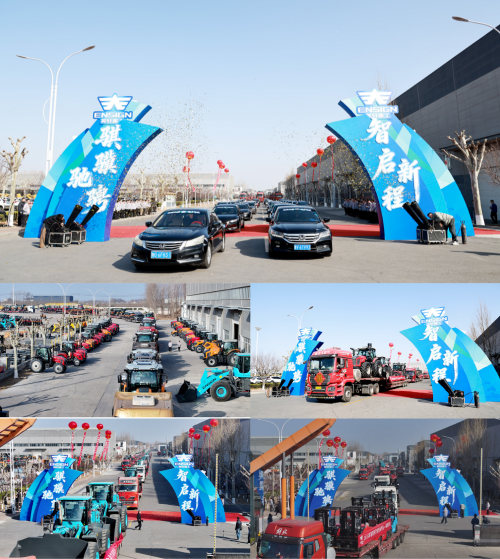 在热烈的掌声中,全体市场人员有序登车,运载英轩装载机、拖拉机、叉车的车队也缓缓驶出厂区,奔赴全国市场,标志着新一轮市场开拓全面展开。